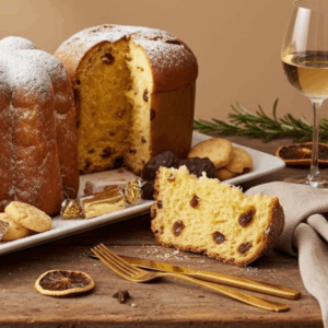 Der Panettone kommt aus Mailand und hat eine kuppelartige Form. Er ist etwas dichter als der Pandoro und wird traditionell mit Rosinen und kandierten Früchten gefüllt. Sein Name soll von einem Küchenjungen namens Toni stammen, der angeblich den Kuchen für ein großes Fest erfunden hat. Der Panettone ist ein bisschen wie ein Abenteuer: süß, fruchtig und voller Überraschungen.