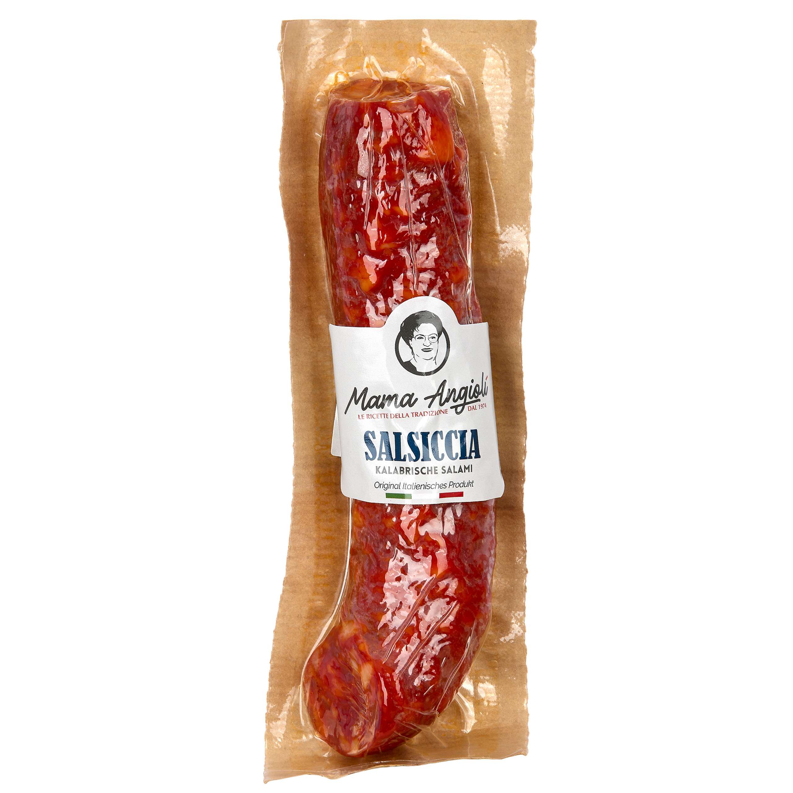 Übrigens: Wie schon zu Mama Angiolis Zeiten wird unsere Salsiccia auch heute noch komplett handgefertigt! Mit Mamas besonderer Rezeptur wird diese aus der Schweineschulter gewonnene Wurst zunächst mit feinstem italienischen Salz und kalabrischem Chili gepökelt und über Buchenholz geräuchert, bevor sie für lange 4 Monate ganz in Ruhe reifen kann. So erhält die Salsiccia ihr herzhaftes und wunderbar mildes Aroma.