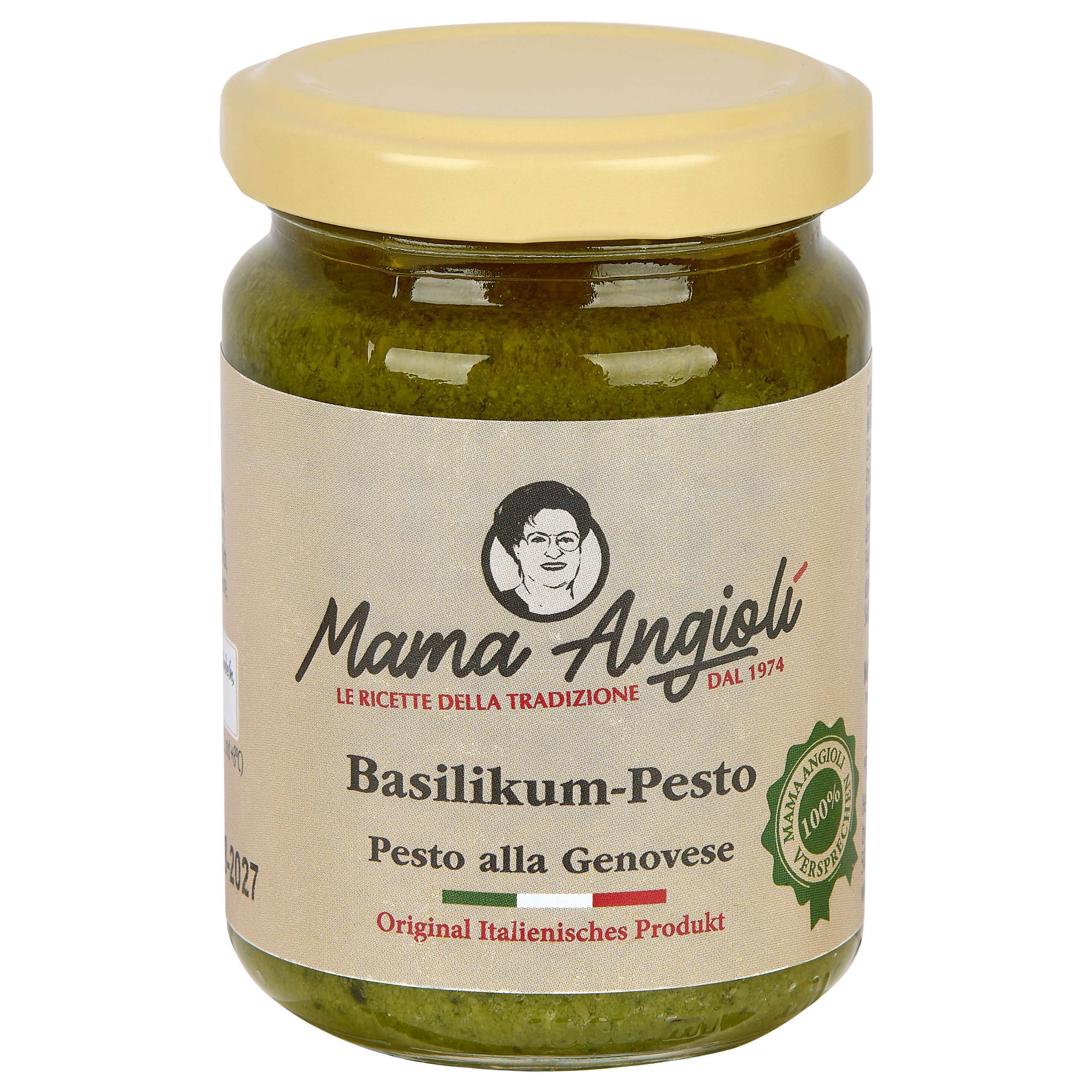 • Mama Angioli Basilikum Pesto (Pesto alla Genovese): Diese Spezialität wird mit echtem Genueser Basilikum D.O.P. hergestellt was für ein unvergleichlich frisches Aroma sorgt. Die cremige Textur entsteht durch die Kombination von hochwertigem Olivenöl mit Cashewnüssen sowie Pinienkernen und wird durch edlen Grana Padano sowie Pecorino Romano Käse vollendet. Ein reines Naturprodukt nach überlieferter Tradition.